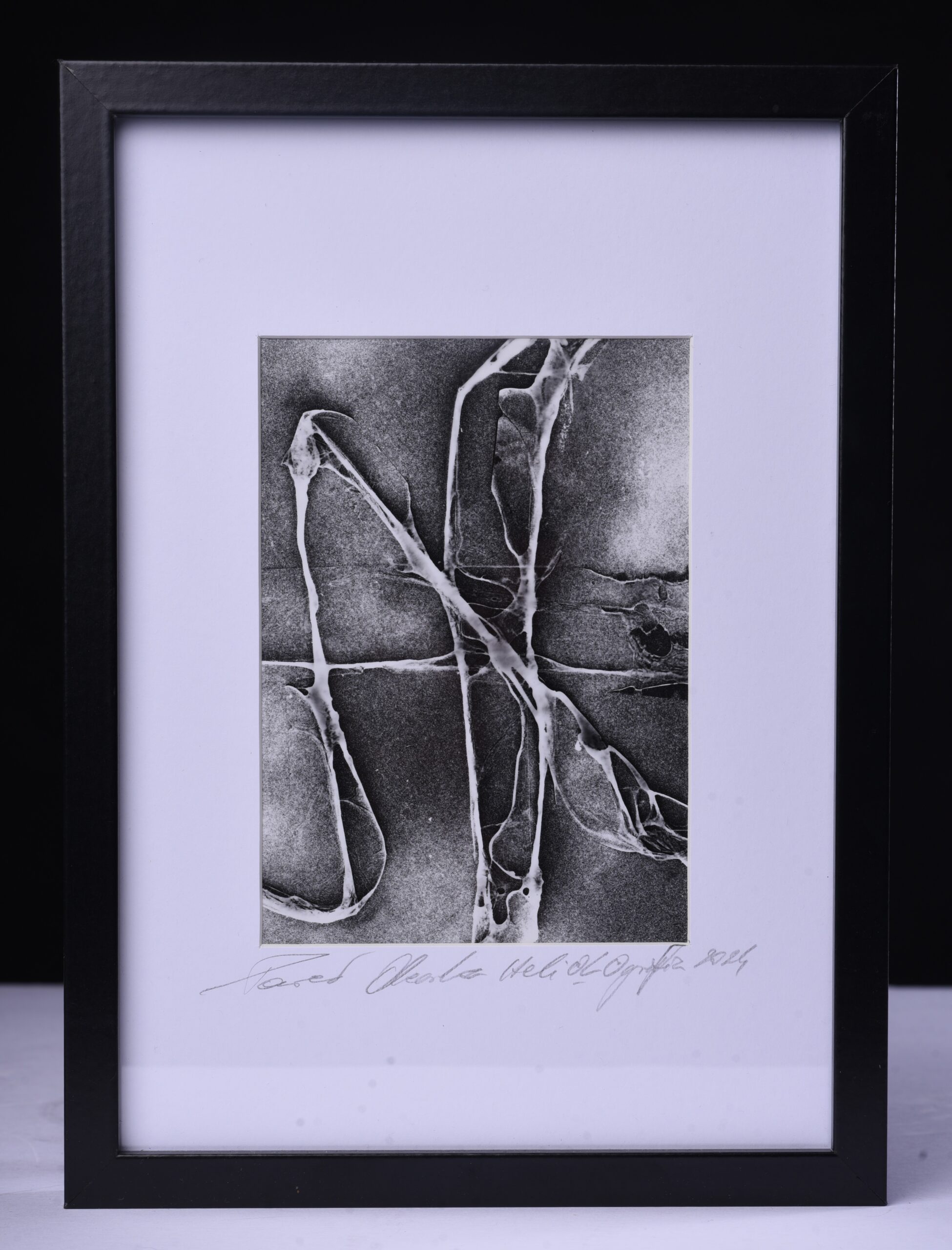 Praca powstała w technice fotografii bezkamerowej, wykonanej w klasycznej analogowej ciemni. Transparentny materiał, poddany działaniu światła, stworzył unikatową, niereplikowalną strukturę. To dzieło, które jednocześnie jest abstrakcją i zapisem procesu — światło działa tu jak rysunek, a materia staje się jego śladem.